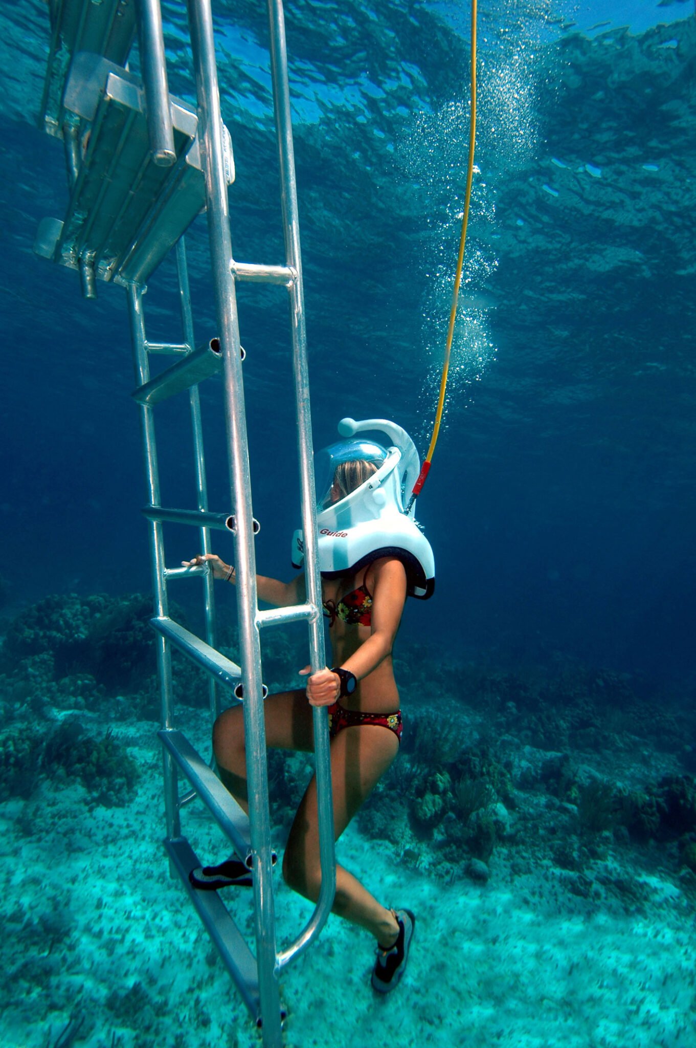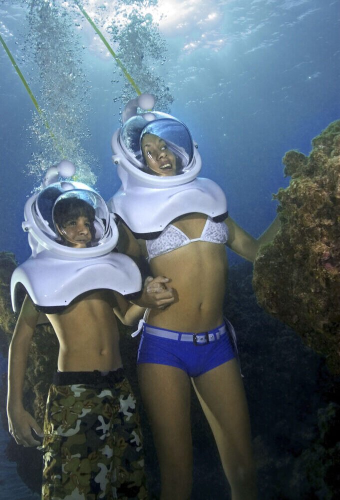 The aquarium is an effortless way to explore the underwater world — it’s as simple as walking and breathing underwater! You will explore an underwater shipwreck, diverse reefs and a great variety of colorful fish. Put on the helmet that is connected to an air tube and you are ready to start discovering and exploring the seabed, without getting your hair wet and without even removing your goggles. One of our qualified divers is at your disposition at all times to assure your safety.